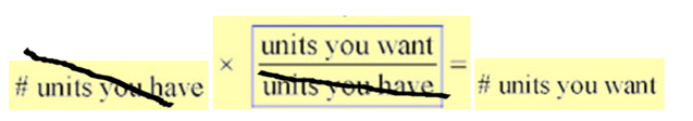 Recall that the fraction portion is your conversion factor and that it is equal to 1. We can now answer the question about which fraction we use since there will always be two possibilities. Your goal is the cancel out the unit of measurement you are no longer interested in. Whatever unit you are given to start with will guide what fraction you use. In other words, you want the unit you are given to start with to be in the denominator. In doing this, you will be left with the unit you want.